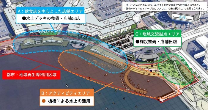 水上デッキや桟橋、商業施設、レジャー空間の整備とカフェや物販店、アクティビティ拠点の設置。