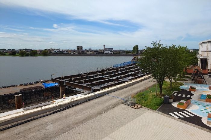令和7年度中の開業を目標とし水上デッキの鉄骨組立など整備工事の進行。