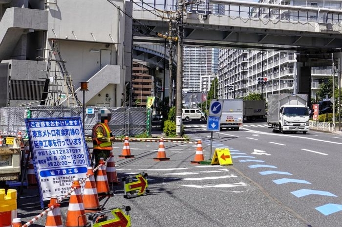 本事業は都市密集地での大規模な地下鉄建設であり、周辺住民の生活や都市機能への影響を最小限に抑えるための施工計画が非常に重要です。豊洲・枝川の両工区では、地下構造物を構築する際、地上部には厚さのある鉄板製の「路面覆工板」を敷設して、車両や歩行者の通行を確保しながらその下を掘削する「開削工法」が採用されます。