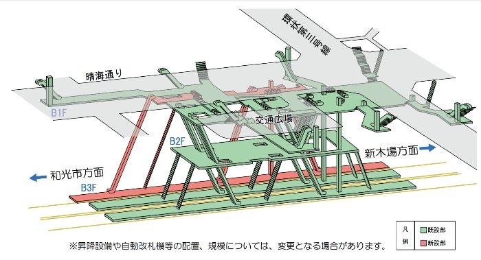 既存の豊洲駅に新たなホームを増設し、混雑緩和とバリアフリー化を推進。地下3層構造の拡張により、将来的な乗客増にも対応できる駅機能を整備。