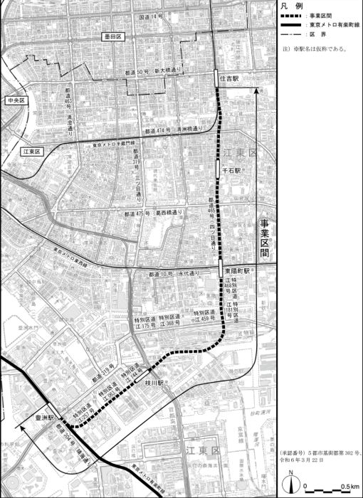 新設駅のひとつである「枝川駅(仮称)」は、江東区道および三つ目通りの地下に整備される予定で、相対式ホームを採用し、地下1階から地下3階までの構造となります。工事延長は約315m、高さ約18m、幅約19mの構造物が構築されます。