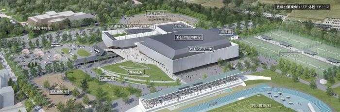 施設デザインは、手筒花火をイメージした縦リブの金属外装を採用し、周囲の木々や空を映す外観に仕上げる予定です。建物はメインアリーナ・サブアリーナ・武道場の3構成で、高さを抑えたスカイラインにより周辺の景観との一体感を演出します。また、ハの字型の平面配置や交流プロムナードの設置により、公園内の回遊性と歩行者動線の安全性を確保し、災害時にも活用しやすい構造とします。