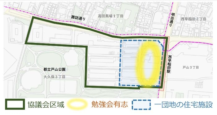 西早稲田駅周辺は交通利便性が高く緑豊かな環境に恵まれている一方で、建物の老朽化やバリアフリーの課題、戸山公園との連携不足が指摘されている。 - 地域の意見交換の方法