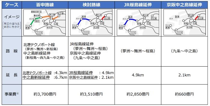 - 答申路線(中之島〜西九条〜新桜島〜咲洲〜夢洲):北港テクノポート線延伸や中之島新線延伸新設。