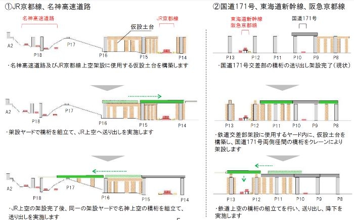 また、設計段階から耐震性や耐風性にも配慮した設計となっているほか、施工面では、国道や鉄道上を横断する高架橋区間は、送り出し架設工法により新設が進められています。