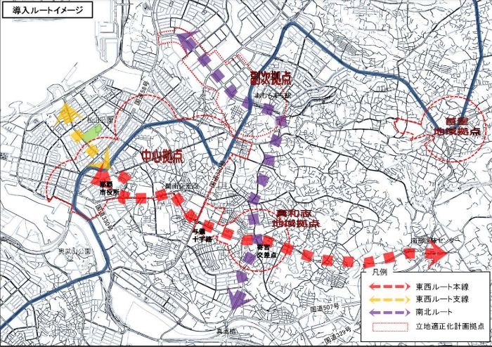 東西ルート本線(県庁北口~南部医療センター付近、約5km)、東西ルート支線(県庁北口~若狭海浜公園付近、約1km)、南北ルート(真玉橋付近~新都心、約5km)の検討。