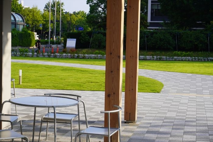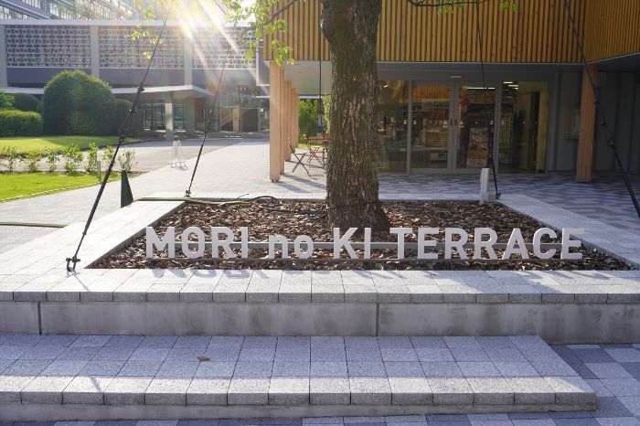 施設の中央には「森の木テラス」と呼ばれるシンボル的な空間が整備されました。ここには県庁の森から移植された大きなクスノキが配置され、木陰の下で憩える落ち着いた場所を演出しています。テラスは人々が自然と集まり、会話や休憩を楽しめる交流の拠点となることを意図して設計されました。