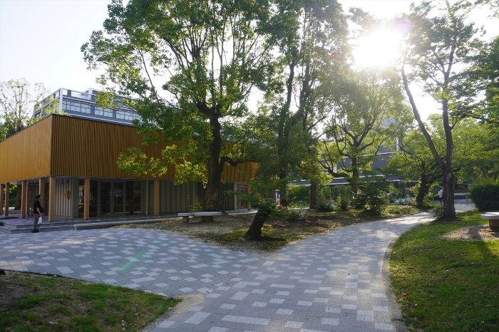 新たに建設された施設は木造の平屋建て2棟で構成されており、開放感と温もりを感じられる建築デザインが特徴です。内部の柱や梁は敢えて現しにすることで木材の質感を際立たせ、訪れる人が自然の素材に包まれるような空間を実現しています。外壁には広島県産のスギ材を用いたルーバーを設置し、地域資源を積極的に活用しました。さらに、この建物は全国で初めて防火地域における木造延焼防止建築物として認定されており、環境負荷の軽減と防災性能を両立した先駆的な事例となっています。都市の中で木の魅力を感じられる施設は珍しく、広島らしい新しい建築のあり方を示しています。