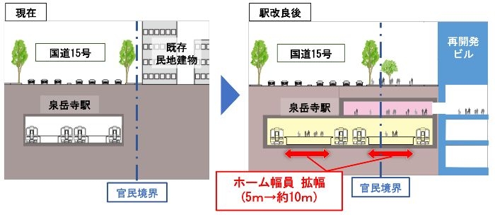 泉岳寺駅の現行ホーム幅は約5メートルと限られており、ピーク時の混雑が課題となっています。今回の改良では、国道15号の地下空間だけでは不十分なため、隣接する民有地も取り込みながら拡幅を行い、ホーム幅を最大約10メートルに拡大する計画です。
