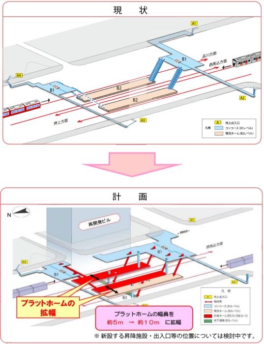 駅利便性向上、利用者安全性確保、バリアフリー化推進、ホーム拡幅・コンコース拡張・昇降施設強化・出入口増設による総合的駅機能改善。 - ホーム拡幅計画