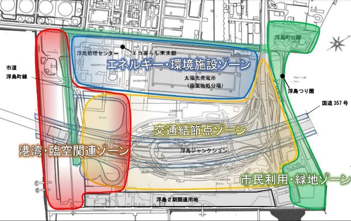 浮島処理センター、かわさきエコ暮らし未来館、臨港消防署浮島出張所の立地、廃棄物処理・環境学習・防災機能、周辺の高速道路関連施設・物流倉庫用地、暫定利用中心。