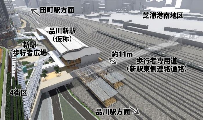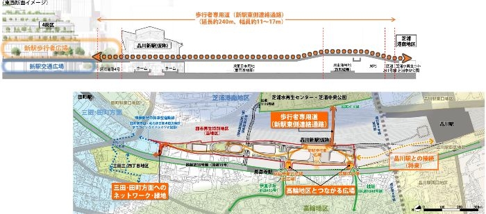 高輪地区や芝浦港南地区、三田・田町方面へと自然に誘導するルートを確保し、駅前広場や公園、緑地と連動することで、地域住民や訪問者が日常的に利用できる環境を整備します。また、駅と街が一体となる都市基盤として、防災対応や環境配慮型のまちづくりにも貢献します。