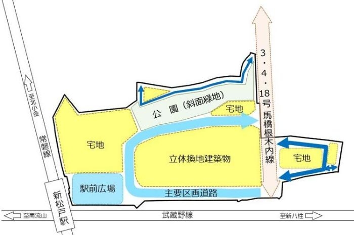 新松戸駅東口の約2.6ヘクタールを対象に、狭あい道路や小規模宅地の密集、駅前広場の未整備、斜面地の防災リスクといった課題を解消し、安全で快適な市街地を形成することを目的とする。 - 立体換地方式の採用