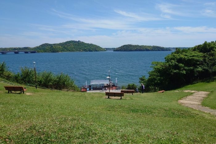 西館、東館、レストラン館の三館構成。多彩な飲食・物販施設、広場や遊歩道からの湖の景観。恋人の聖地としてハートロックや幸せの鐘の設置。