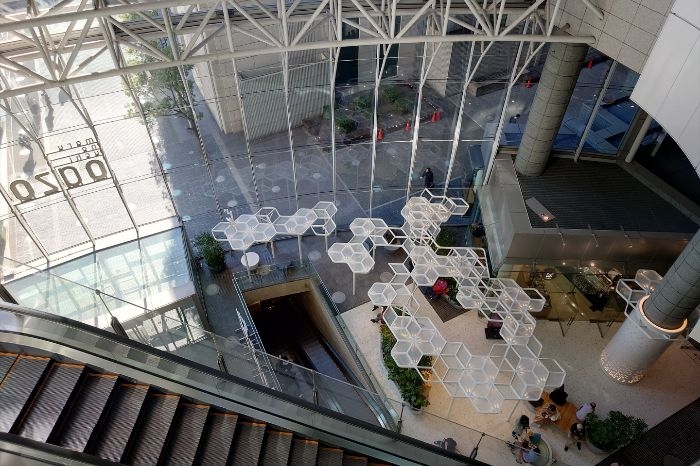 1階アトリウムには木立をイメージしたキャノピーを設置し、都会のオアシスを思わせる滞留空間に一新。 - 飲食フロアの改装