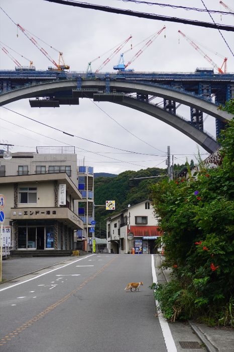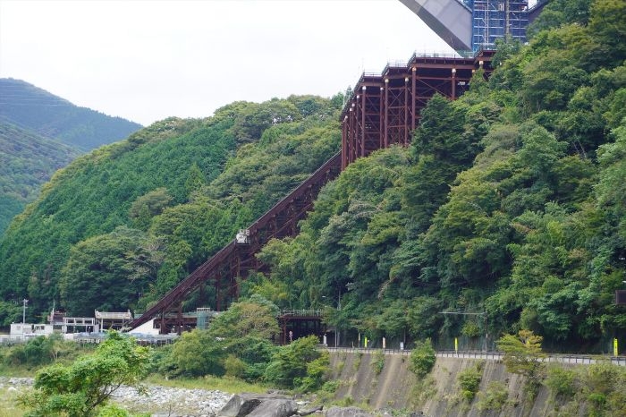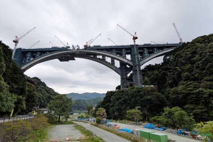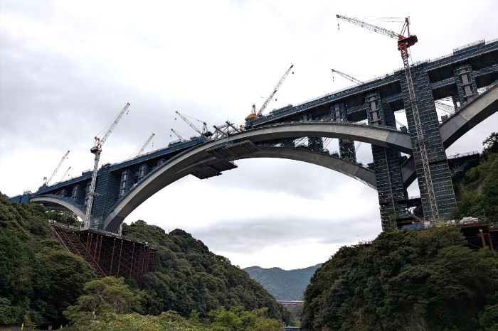橋の施工には、鋼とコンクリートを組み合わせた複合構造が採用されています。最大支間長220mは、国内のバランスドアーチ橋としては最大級の規模です。移動式作業車や張出工法、特殊リフトを駆使して施工し、アーチ部の最大傾斜は40度に達します。施工前にはアクセスルート整備に4年を費やし、300mのトンネルや巨大インクラインを設置して現場に資材を運搬しました。こうした工夫により、急峻かつ狭隘な地形でも安全に施工が可能となっています。