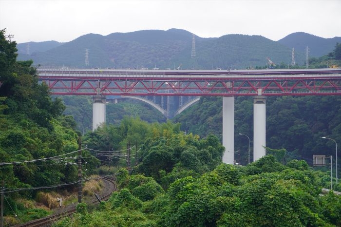 丹沢山地河内川上空約125mに架かる橋。上り線771m、下り線692m、最大支間長220m。東名高速の渋滞緩和と災害時迂回路の重要拠点。