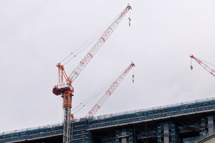 一日最大350人が従事。移動式作業車やインクラインで資材搬入。特殊アクセスルートやトンネル整備による安全施工。