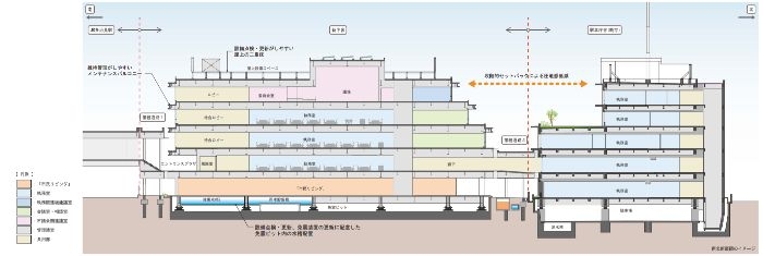 防災拠点としては、3日間稼働できる非常用発電設備を備え、断水時にも使用可能な給水・排水システムを整備。免震ピット内の貯水槽には7日分の生活用水を確保し、地震や豪雨災害など非常時にも行政機能を継続できる体制を整えます。さらに、非常時には広場と一体で避難スペースや救援物資拠点としての活用も想定しています。