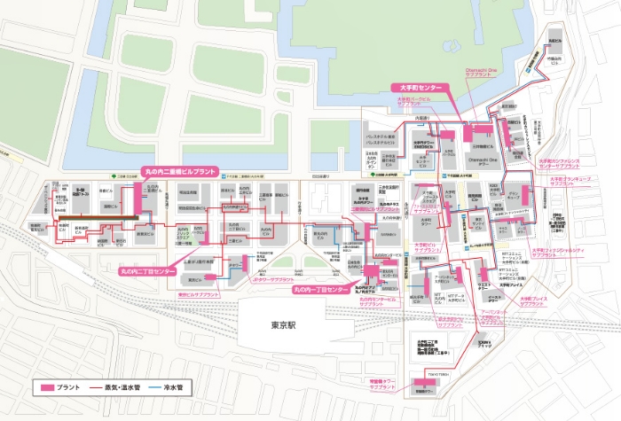 丸の内エリアでは、CO₂削減や環境配慮型都市づくりを推進するため、「大手町・丸の内・有楽町地区まちづくりガイドライン」および千代田区の地球温暖化対策条例に基づき、面的な環境対策が求められています。地域冷暖房は、個別ビルに熱源設備を設置するよりも一次エネルギー消費を大幅に削減し、CO₂削減にも大きく寄与する重要なインフラです。