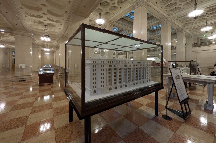1、2階の展示エリアには、新たに明治生命館の大型模型、歴史を映像で辿るコンテンツ、建物のディテールや設計の魅力を解説するパネルなどが整備されました。昭和初期の古典主義建築として、コリント式列柱やアカンサス文様などの装飾が特徴である明治生命館の建築美を深く理解できるようになっています。