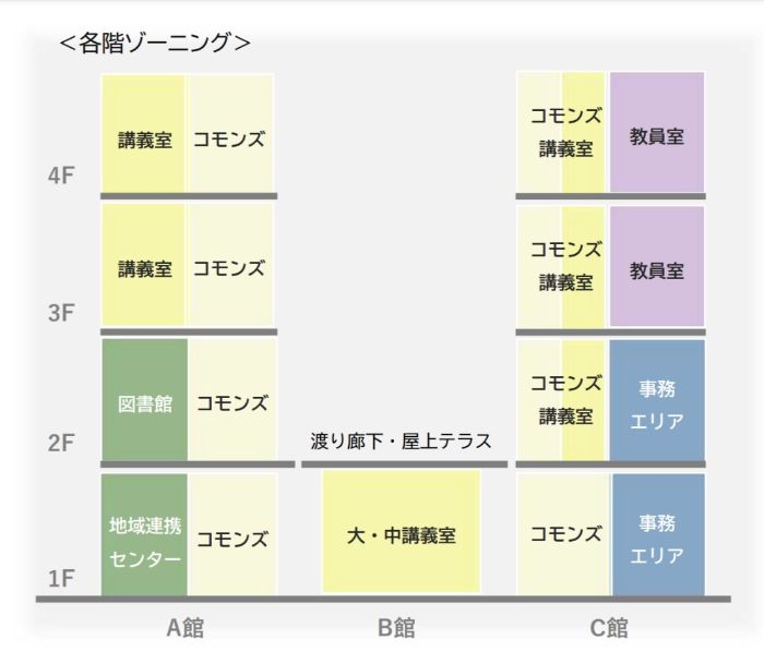 各棟は学習・交流・事務機能を明確にゾーニングしつつ、渡り廊下や屋上テラスで一体的に利用可能とする計画です。A館の各階には多様なコモンズを配置し、学生の学習や交流の場を広く確保しています。講義室は規模や授業内容に応じて可変利用でき、2階の図書館は自律的な学びと交流を促進します。C館では教員室や事務機能とコモンズが一体化しており、学生との交流を促す設計となっています。B館には355席の大講義室や可動席の中講義室を設け、授業や地域連携イベントへの活用も想定されています。全体として、学びの多様化とオープンな交流を両立する設計が特徴です。