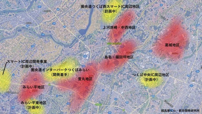 2005年のつくばエクスプレス開業は最大の転機で、人口流入や商業需要が高まり地区計画の見直しが繰り返し行われています。