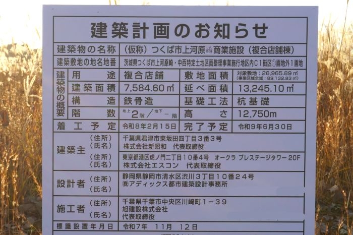 本地区の注目事業として、新昭和とエスコンが共同で計画する(仮称)つくば市上河原崎商業施設(複合店舗棟)があります。地上2階、延床面積約13,245㎡の複合商業施設で、令和9年6月の完成予定です。圏央道つくば西スマートICや万博記念公園駅からのアクセス性を活かした広域型商業施設で、飲食、物販、サービスなど多様なテナント構成が想定されています。