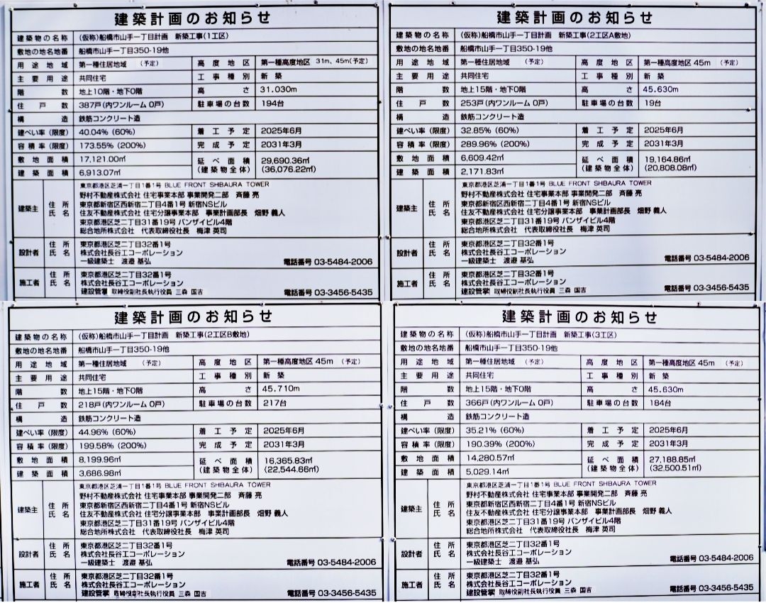 本プロジェクトは、野村不動産、住友不動産、総合地所の3社が共同で推進し、設計・施工は長谷工コーポレーションが担当する大規模な住宅開発です。計画では全体を4つの工区に分けてマンション群が整備され、「1工区」には10階建て・387戸、延べ床面積約36,000平方メートルの建物が配置されます。さらに、「2工区」はA敷地とB敷地に分かれており、「2工区A敷地」には15階建て・253戸、延べ約20,800平方メートル、「2工区B敷地」には同じく15階建て・218戸、延べ約22,500平方メートルのマンションが計画されています。加えて、「3工区」には15階建て・366戸、延べ約32,500平方メートルの建物が整備される予定です。