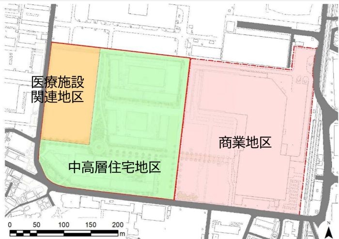 工場跡地を転換し、住宅・医療・商業が連携する複合市街地を創出する都市計画方針。