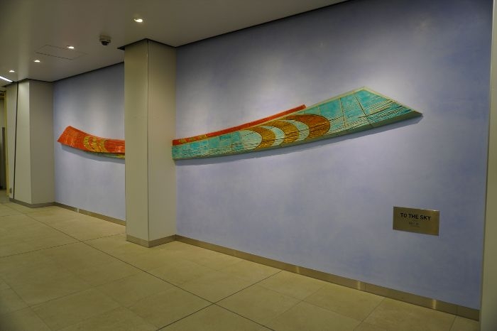 本作品は2012年、東京スカイツリー開業に合わせて駅1階コンコースに設置されたもので、空へ伸びるスカイツリーの姿と業平の地に息づく日本の伝統的イメージを重ね合わせたデザインが特徴です。今回の鉄道高架化に伴う駅舎移設により、製作を担ったクレアーレ熱海ゆがわら工房が取り外し・修復を行い、新駅舎へ丁寧に再設置しました。縦3メートル・横4メートルの2面からなる大型陶板レリーフは、長く親しまれてきた公共財として次世代へ継承されます。