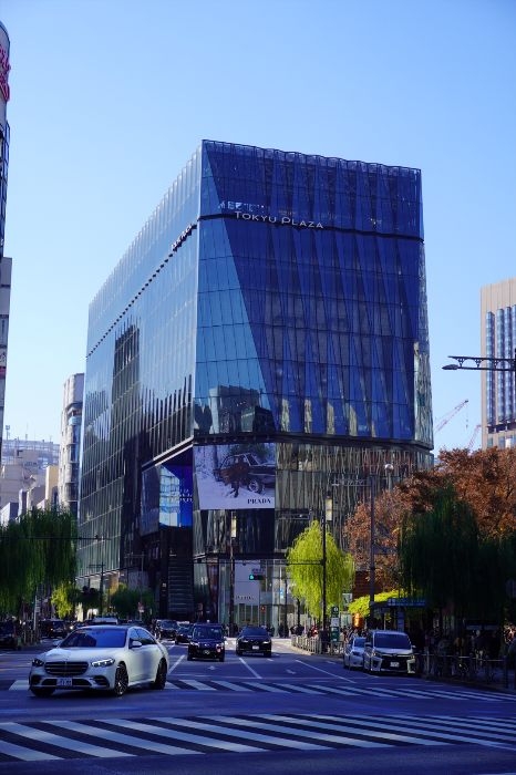 旧・東急プラザ銀座、現・GinzaNovoの建物は、「光の器」をコンセプトに、伝統工芸・江戸切子をモチーフにした立体的なガラスファサードを纏っています。時間帯や天候によって多彩な表情を見せる外装は大きな特徴で、銀座の街並みに調和しながらも象徴性の高いデザインです。