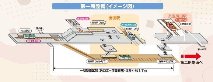 第一期整備では、矢口渡駅付近からJR・東急蒲田駅を経由し、京急蒲田駅付近までの約0.8km区間が対象となります。東急多摩川線と新空港線が直通運転を行うことで、蒲田地区における鉄道ネットワークの断絶が解消され、都市構造そのものを更新する効果が期待されています。