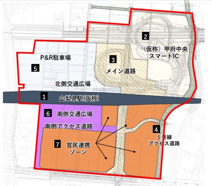 甲府市は2025年に「リニア山梨県駅前エリアのまちづくりについて」を公表し、駅前約24.5haを対象とした整備方針を示しました。北側にはスマートIC、パークアンドライド駐車場、北側交通広場を配置し、南側にはアイメッセ山梨に隣接した官民連携ゾーンと南側交通広場を整備する計画です。