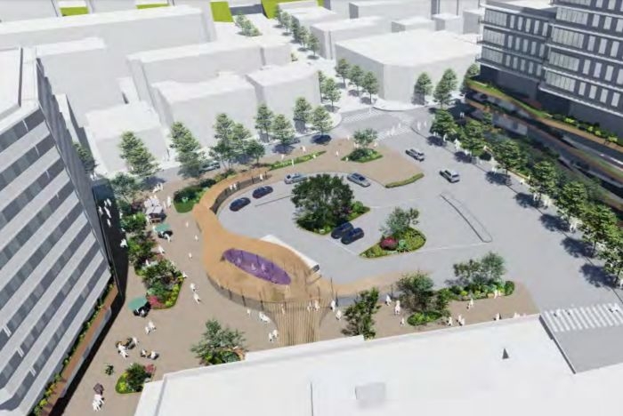 公園と病院を一体的に再整備し、緑豊かで開放感のある駅前空間を創出。