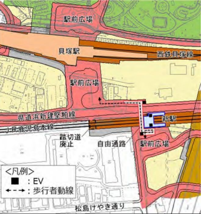 JR貝塚駅の整備にあわせて、駅周辺では交通環境の改善も進められます。新駅付近にある市道箱崎157号線の踏切は廃止され、その代替として南北を結ぶ自由通路が新設される計画です。自由通路は延長約50m、有効幅員5mで、屋根付き・24時間通行可能とされ、自転車の通行にも対応します。