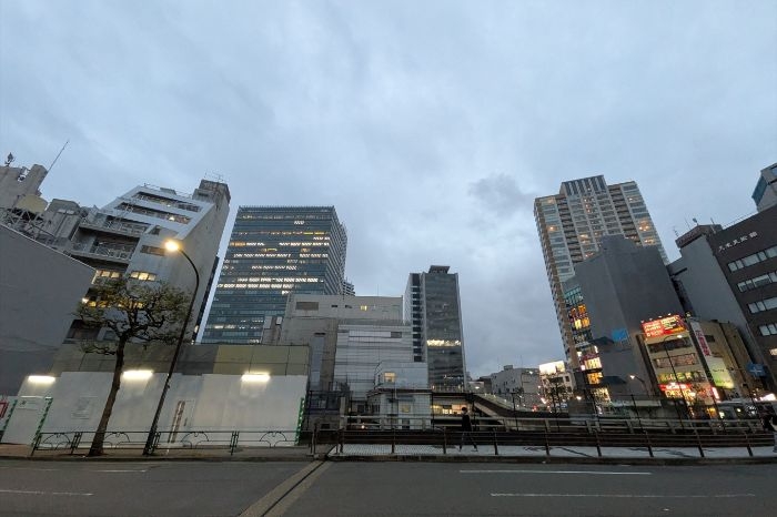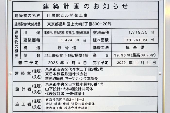 「JR目黒ビル」は、東京都品川区上大崎二丁目に位置し、現地仮囲いに設置されたお知らせ板から、敷地面積は1,719.35㎡、延床面積は13,261.24㎡を計画していることが確認できます。また、建物は鉄骨造で、地上9階・地下1階・塔屋1階、高さは39.96メートルとなる予定です。