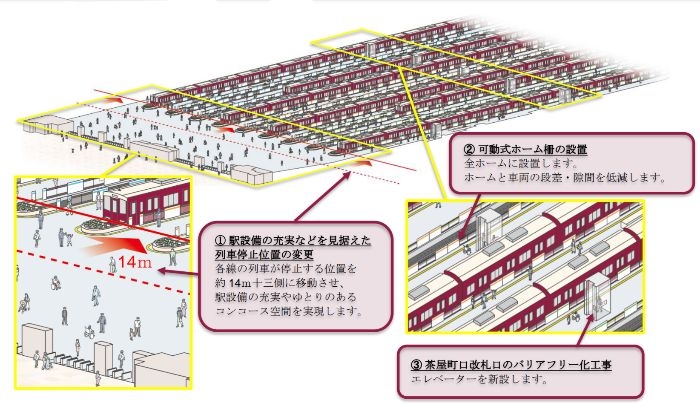 さらに中長期的には、2031年頃から全ホームへの可動式ホーム柵設置が予定されており、ホーム床面の改良とあわせて段差や隙間の低減も進められます。加えて、茶屋町口改札では2026年春頃からエレベーター設置工事が始まり、北側街区とのバリアフリー連絡が強化される見込みです。駅単体の利便性向上だけでなく、周辺まちとの一体的な動線形成が強く意識された整備内容となっています。