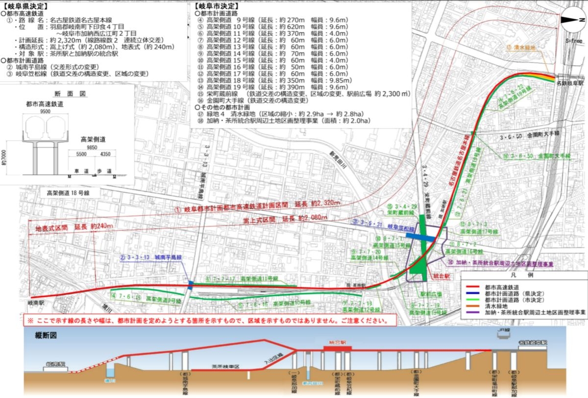 名古屋鉄道名古屋本線加納駅・茶所駅付近連続立体交差事業は、岐阜市中心部における鉄道と道路の交差を抜本的に改善するため、名鉄名古屋本線の一部区間を高架化する都市計画事業です。対象区間は羽島郡岐南町下印食四丁目から岐阜市加納西広江町二丁目までの2,792m(うち連続立体交差事業区間2,049m)で、現在の加納駅と茶所駅を統合した(仮称)統合駅の整備も行います。