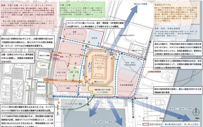 多目的スタジアムと相乗効果を発揮する都市機能として、オフィス、商業施設、ホテル、マンション、学校、レジャー施設、子育て支援施設、文化施設、研究機関などが抽出されました。