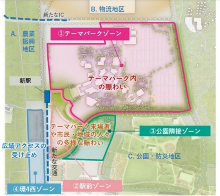 テーマパーク・駅前商業・自然共生型施設など多機能ゾーニングの構成