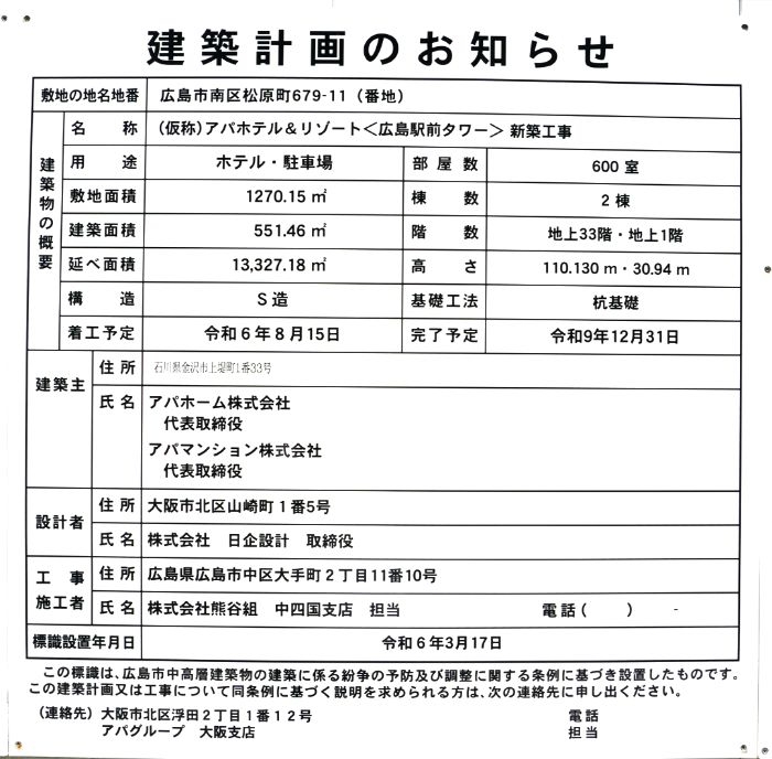 計画名 (仮称)アパホテル&リゾート〈広島駅前タワー〉新築工事