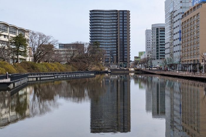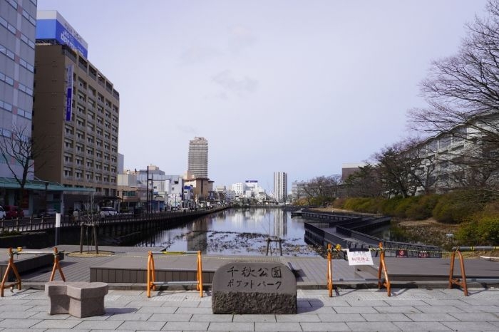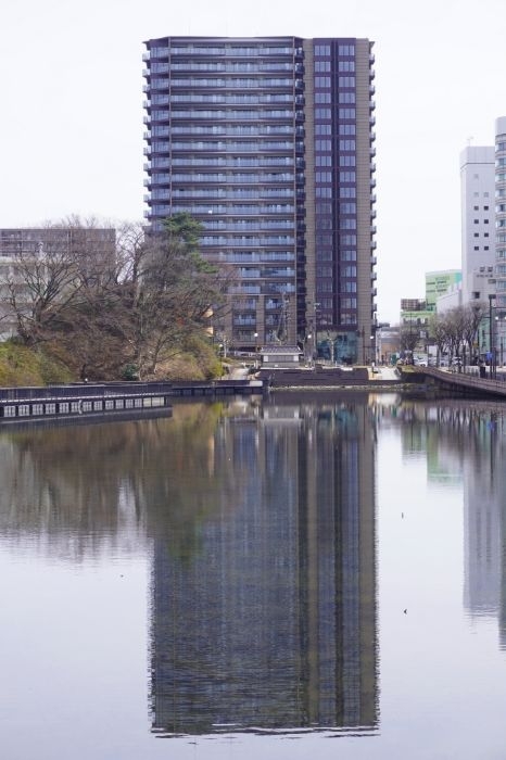 千秋公園の「大手門の堀」とレーベン秋田 THE IMPERIAL TOWERの様子です。