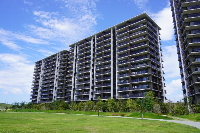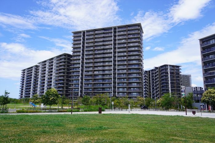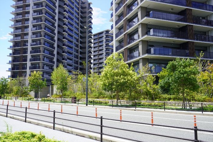 グリーンベルトから見たフォレストプレイス香椎照葉ザ・テラスの様子です。