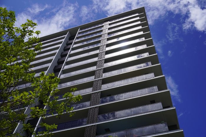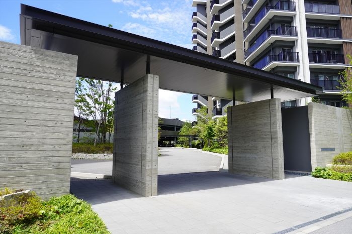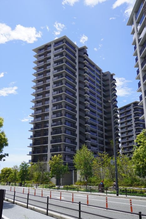 ​外観デザインは、バルコニー床や庇を重ねた水平ラインと、マリオンによる垂直ラインが際立つ構成となっています。手摺にはガラスや木目調の格子を採用し、素材感の対比が美しい意匠を創出しています。