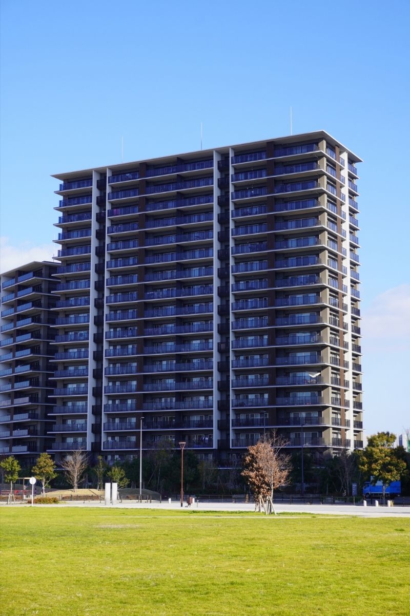 ​外観デザインは、バルコニー床や庇を重ねた水平ラインと、マリオンによる垂直ラインが際立つ構成となっています。手摺にはガラスや木目調の格子を採用し、素材感の対比が美しい意匠を創出しています。