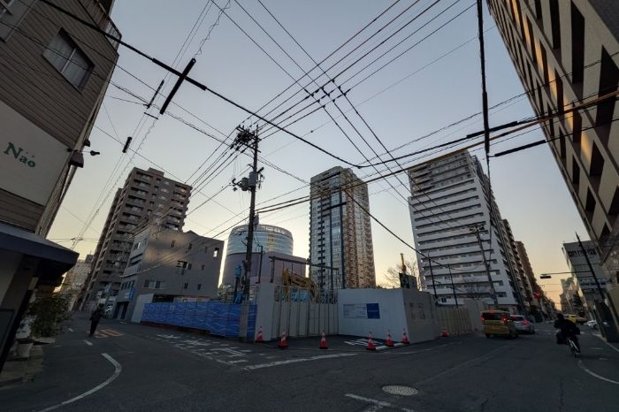 南西側から見た建設中のロイヤルガーデンタワー天神町の様子です。