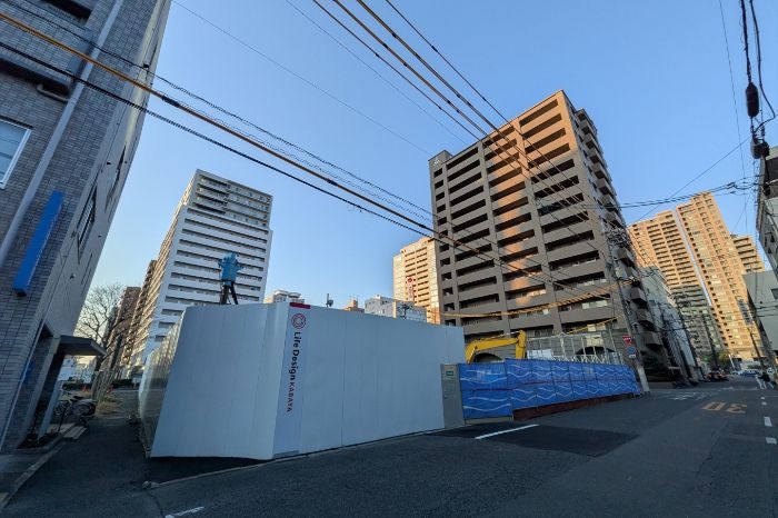 北東側から見た建設中のロイヤルガーデンタワー天神町の様子です。