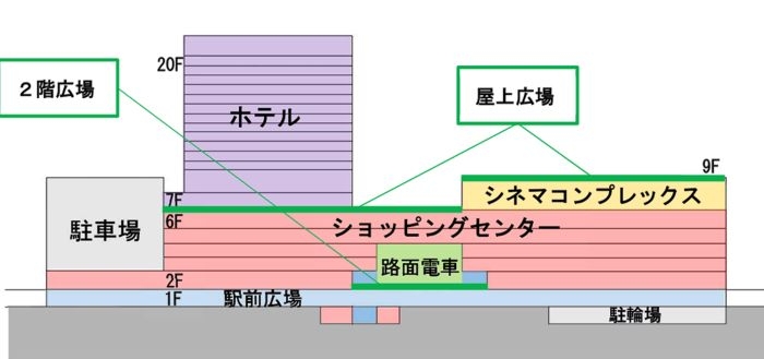 ▼施設構成 地下1階:駐輪場 地上1階:南口駅前広場 2階:路面電車駅施設、駅前広場 地下1階~地上6階:商業施設「minamoa (ミナモア)」 7階~8階:シネマコンプレックス 7階~9階:屋上広場「ソラモア広場」「ウッドデッキ広場」 7階~21階:ホテル「ホテルグランヴィア広島サウスゲート」