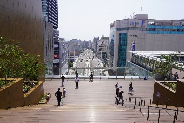 駅前通りを望む大階段は、眺望スポットとしても利用可能で、階段を客席としてステージイベント(音楽・ダンスなど)を実施できる多目的空間です。